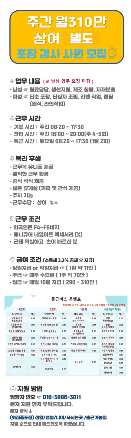 키워드 | 주간 경력무관 외국인 채용 기숙사 통근버스 식사제공 상여금 |